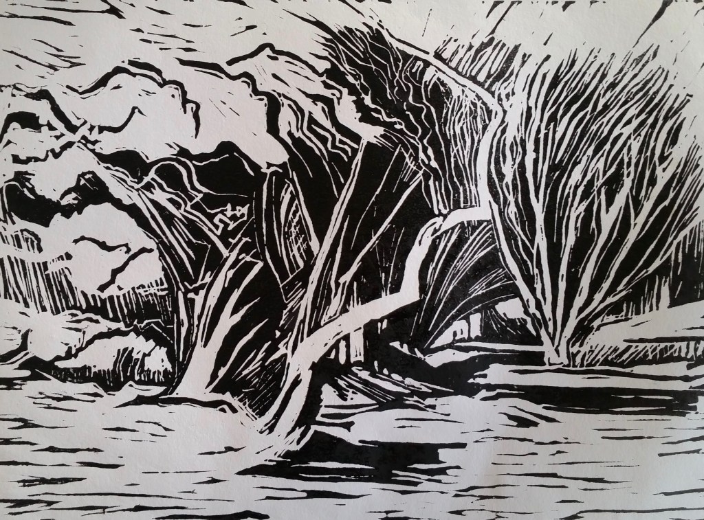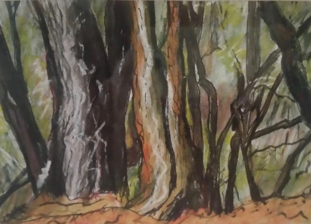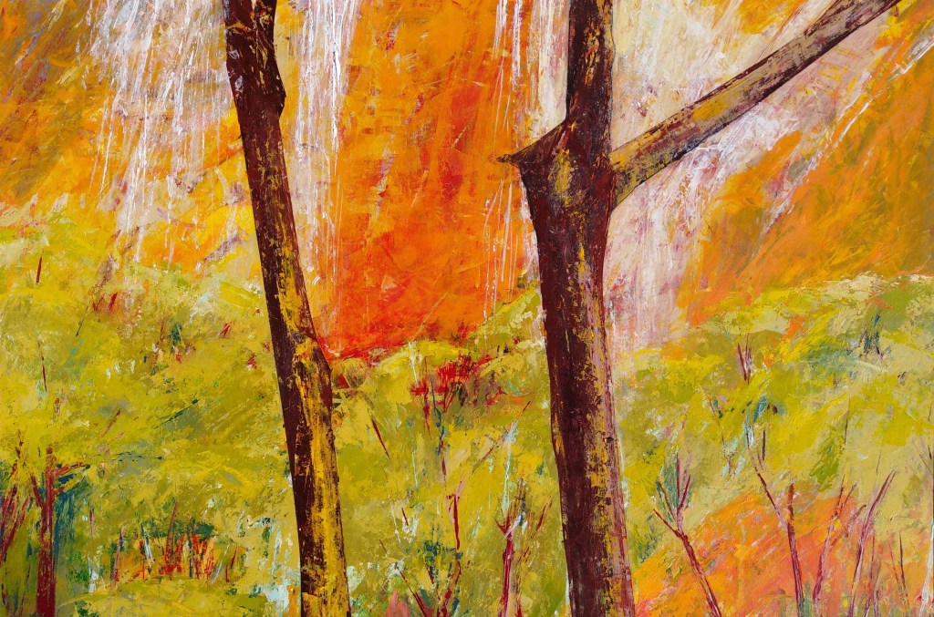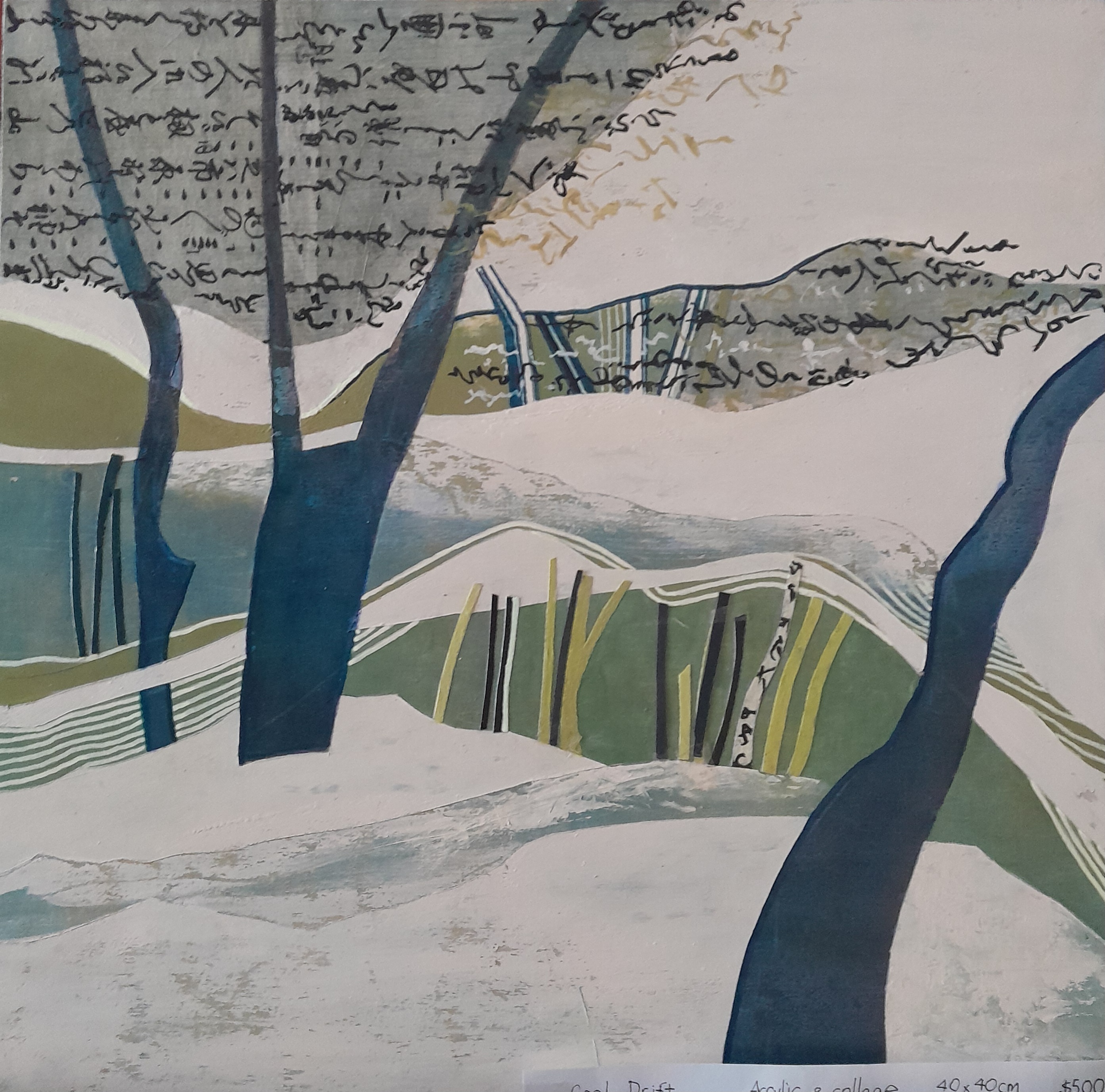 The Wood and the Trees  Acrylic and collage. 61×61 cm Framed canvas $600