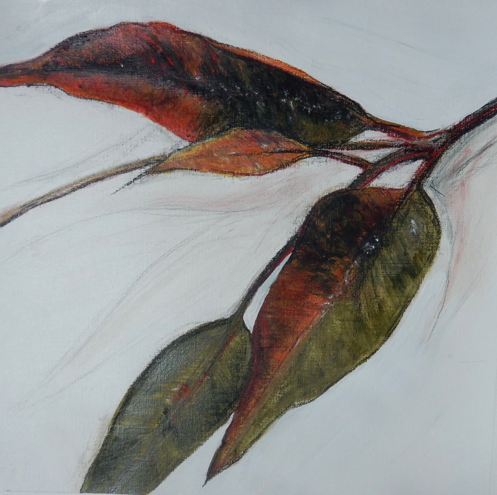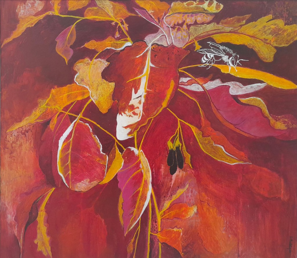 In Botanic Gardens Wood-burning and acrylic.on board 25x25cm. $350